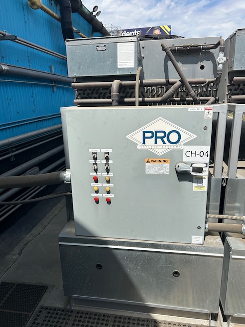 Used 4.5 HP glycol chiller, Mfg. by Pro System. Model #NAC-55-G. max design pressure (high side) 450 psig, refrigerant saturation pressure 450 psi @ 125°F. (3) 1.5 HP electrical motor, 3Phase/60Hz/460V each. Past use in brewery.
