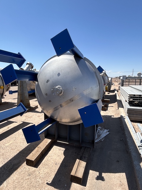 Unused 1320 gallon vertical 304L stainless steel vessel. Oil/Vapor separator. Mfg. by Equipromex (Mexico) in 2022. 4'11" diameter x 8'0" T/T. Dished top and bottom. On leg supports.