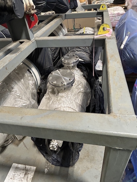 Unused 417 sq. ft. vertical heat exchanger. Mfg. by Wuxi Zhicherg Biochemical Eng. in 2021. 0.6 Design duty (MMBTU/Hr). Shell: 174 psi @ 428 deg. F. Tubes: 116FV psi @ 428 deg. F.; 20" x 6'6". Oil/Steam Heat Exchanger. Under Nitrogen Purge.