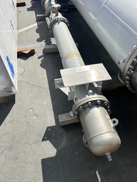 Unused 96 sq. ft. vertical heat exchanger. 0.4 Design duty (MMBTU/Hr). Mfg.by Alliance Fab (Graham) in 2022. Shell: 150 psi @ 212 deg. F. Tubes: 150FV psi @ 400 deg. F.; 10" x 72". Secondary Surface Condenser. Under Nitrogen Purge