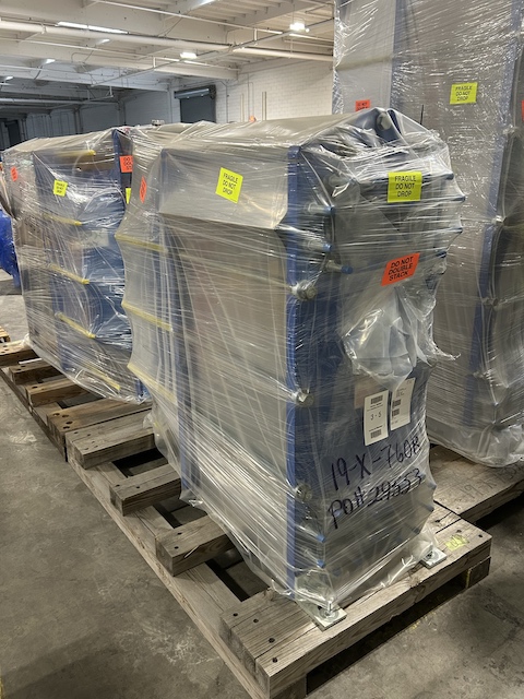 Unused 1,021 sq. ft. vertical Plate and Frame heat exchanger. 8.7 Design duty (MMBTU/Hr). Mfg. by APV (SPX Flow) in 2023. Shell: 150 psi @ 320 deg. F. Tubes: 150 psi @ 320 deg. F.; Model #L039M-10. Treated Feed Rundown Cooler. Under Nitrogen Purge.