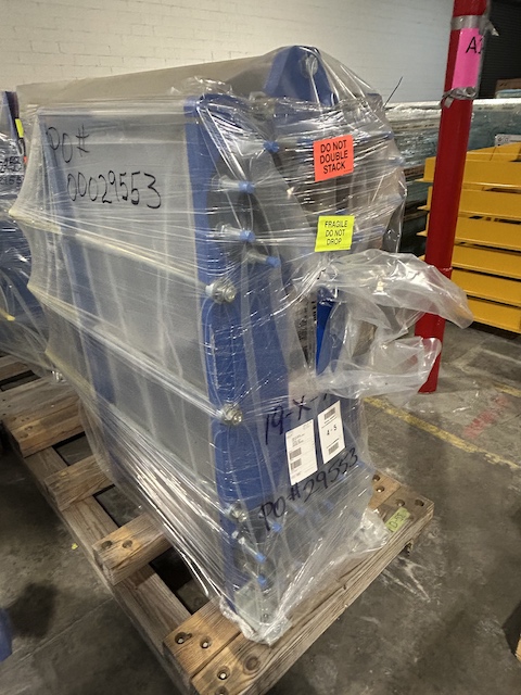 Unused 1,021 sq. ft. vertical Plate and Frame heat exchanger. 8.7 Design duty (MMBTU/Hr). Mfg. by APV (SPX Flow) in 2023. Shell: 150 psi @ 320 deg. F. Tubes: 150 psi @ 320 deg. F.; Model #L039M-10. Treated Feed Rundown Cooler. Under Nitrogen Purge