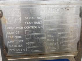 Used 94 gallon 304L Stainless Steel Vertical Tank. Mfg. by Winbco in 2015. 2'0" diameter x 4'0" T/T. On Leg Supports. Previous Service: Standpipe.