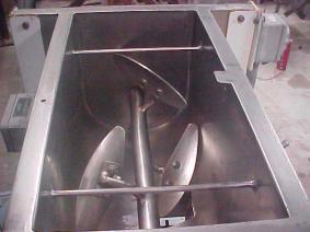 PREVIOUS SERVICE - LAB PELLET BLENDER; SS INTERNAL & EXTERNAL; 12" WIDE X 24" LONG X 16" DEEP MIXING TROUGH; 1.75" DIA X 24" LONG SHAFT WITH (4) PLOW TYPE BLADES; WITH INTERNAL TOP GRATING; REMOVABLE TOP LID; MOUNTED ON 4 LEGS; 5 1/2" X 7 1/2" BOTTOM MANUAL OPERATED DISCHARGE; GEAR DRIVE; 1 HP, 1723 RPM, 115/230 VOLTS;