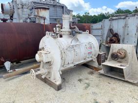 Uaed Littleford plow blender. 43 cubic feet, 304 stainless steel. Model FKM1200 E. PROVISIONS FOR TWO CHOPPERS;43.3 TOTAL CUBIC FEED; 26 CUBIC FEED WORKING CAPACITY; FV INTERNAL; 75 PSI JACKET; 100 PSI HYDRAULIC DRIVE; MOTOR 100 HP; 230/460 VOLTS; 1780 RPM; 405T FRAME; 6 PADDLES; 6" SHAFT DIAMETER; The stainless steel shaft is 6" Diameter X 64" long. There are four stainless steel plows that are 12" Long X 10" wide ( at blunt end) mounted on 3 1/2" X 3 1/2" mounting blocks. There are two stainless steel end scrappers that are 12" long X 12" wide ( at blunt end ) mounted on 3 1/2" X 3 1/2" mounting blocks.