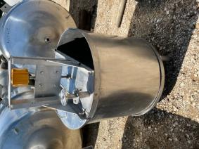 Used stainless steel 120 gallon vertical tank. 34" x 32". Atmospheric. Flat bottom and flat hinged top. Set up for bridge mount agitation. Shaft and blades inside tank.