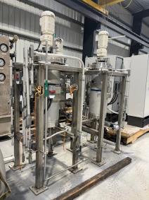 Unused 31 gallon (.12m3) vertical Production Vessel. Mfg. by SRI (Special Restvrijstaal Industrie BV) designed by GEA Messo PT in 2013. 12" diamter x 42" T/T. 304 Stainless Steel. Flat flanged bolted top and welded flat bottom. Stand mounted supports. 2.2 kw top center mounted with internal spiral type agitation. 13/64" shell wall thickness. All nozzles are sanitary clamped and the vessel is stand mounted with manual on/off controls for the agitator.