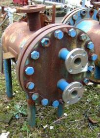 0.8 SQ METER 316SS PLATE HEAT EXCHANGER; MFG. BY APV BAKER IN 1996; TYPE 3HH-208/1; UNIT W/CS CYLINDRICAL SHELL, BOLTED DISHED TOP, WELDED FLAT BTM. WELDED FLAT BTM. (23)316SS CYLINDRICAL PLATES INSIDE SHELL (VERT PLATES). (4) CS LEGS;