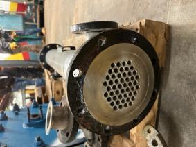 Used 26 sq. ft. Shell & Tube small horizontal Exchanger. Mfg. by Futura Titanium Corp. Titanium tubes MOC. Model #WF6-1-48. (50) tubes, 4' tube length.