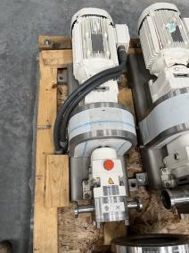 Unused Product Pump. Mfg. by Fristam. Rotary Lobe type. Stainless Steel, Horizontal, Model FL-55-S, 1" x 1", 0.36 m3/hr capacity, nozzles are sanitary clamped. With electric motor, 2.2 KW, 1735/263 r/min1 drive speed, 277/480 drive voltage.