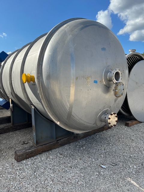 Unused 4500 gallon vertical 304 stainless steel vessel with 316L stainless steel steam coil. Oil collecting tank. Mfg. bu Equipromex (Mexico). 7'5" diameter x 12'0" T/T. Cone bottom. On leg supports.