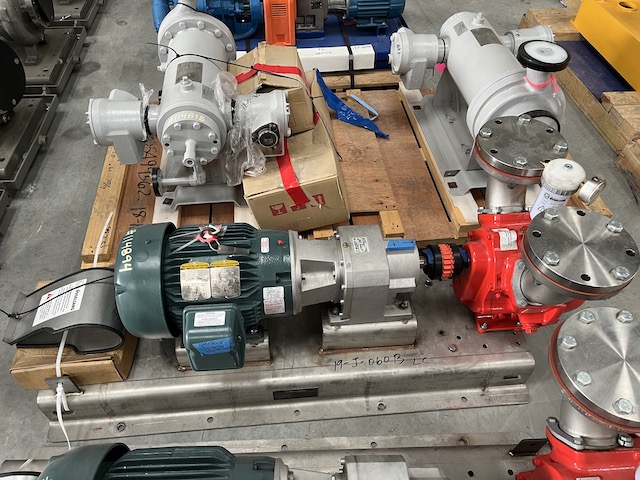 Unused Horizontal Positive Displacement DAF Float Transfer Rotary Lobe Pump. Mfg. by Vogelsang. Model IQ112-114. 110 gpm. Discharge Pressure 40 psi. Discharge Head 92 ft. Inlet pressure 0.0 psi. Differential pressure 40 psi. Rated power 5.2 BHP. Pump speed 370 rpm. Motor Mfg. by Baldor, 7.5 hp, 1765 rpm, 460 volts. Nord Gearbox - gear ratio 4.61, frame 210 TC.