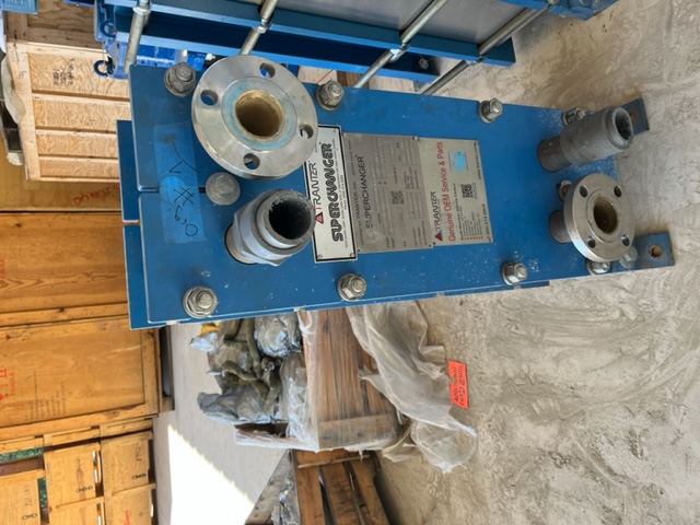 Used 113 sq. ft. Plate Heat Exchanger. Mfg. by Tranter (Superchanger) in 2019. Model GCD-016-M-5-NR-77. 150 psi @ 212°F. Plate Pack Dimensions: 6.88" minimum. 85 Max plate count for frame assembly, 77 plates @ shipment.7.06" maximum. (2)2" inlets and (2)2" outlets.