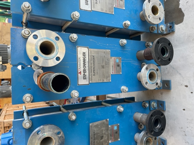 Used 113 sq. ft. Plate Heat Exchanger. Mfg. by Tranter (Superchanger) in 2019. Model GCD-016-M-5-NR-77. 150 psi @ 212°F. Plate Pack Dimensions: 6.88" minimum. 7.06" maximum. (2)2" inlets and (2)2" outlets.