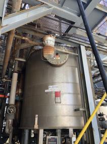 "As Is, Where Is" Used glass lined single wall receiver. Mfg. by Pfaudler in 1998, Model #CV101-5600-35. Nozzles: Bottom 8". Top (5)3", 18". Side (8)3", 20", 24" Manway. Leg supports.
