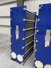 696 sq. ft. Plate Heat Exchanger, Mfg. by Kelvion in 2022. With 316L Stainless Steel Plates. Rated 145 psig @ 230 deg. F. Model #NF150LBA150, plate type NF150L. 85 plates. 1mm plate thickness. NBR gasket material.