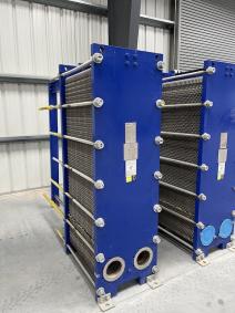 495 sq. ft. Plate Heat Exchanger, Mfg. by Kelvion in 2022. With 316L Stainless Steel Plates. Rated 145 psig @ 230 deg. F. Model #NF150LBA150, plate type NF150L. 61 plates, 1mm plate thickness. NBR gasket material.