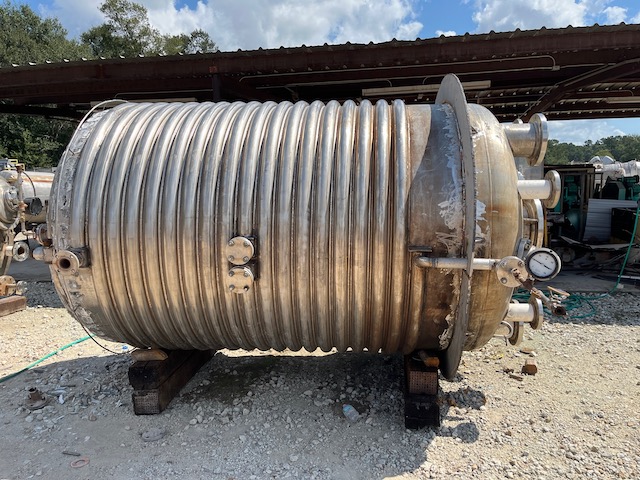 Previously Utilized in an API Facility. Used 1,500 gallon vertical Process Reactor; Mfg. by Alloy Fab. 316L stainless steel, Shell 90 FV psi @ 390 deg. F. Jacket rated 230 psi @ 450 deg. F. 316L stainless steel 3" half pipe coil jacket, (5) turns @ 4 1/2" pitch shell bottom head and (2) zones of (9) turns @ 4 1/2" pitch on shell O.D. With dished heads. On lug supports. (4) Internal side wall baffles.