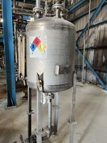 Used 100 gallon vertical 304 stainless steel toluene tank. Mfg. by Alloy Fabricators in 1997. 2'6" diameter x 2'6" T/T. 15FV psi @ 150 deg. F. Dished heads, on leg supports.