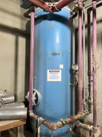 Used 660 gallon vertical carbon steel air receiver. Mfg. by Manchester in 1991. 150 psi @ 650 deg. F. Dished heads, on skirt support.