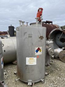 Used 600 gallon vertical, 304 stainless steel tank. Mfg. by Bendel in 2009. 1.312 specific gravity.  Clamp on top mounted Pro Quip agitator, Model #PRG-075, .75 hp, 1800 rpm, 230/460/3/60 TEFC, 1" diameter shaft extending 60" below mounting surface. (2) sets of 12" diameter hydrofoil impellers, 400 rpm shaft speed, 316 stainless steel wetted parts. Top 18" manway. Previous Service 36 NAOH day tank.