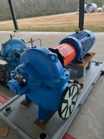 Used/Reconditioned Goulds Cooling water horizontal centrifugal Pump. 4775 gpm @ 118' TDH. 200 hp @ 1800 rpm drive. Cast iron casing and bronze impeller.