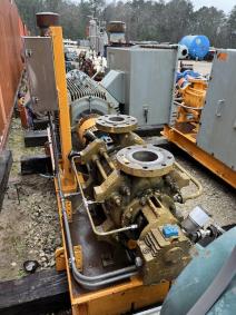 Used high pressure multistage ring section pump. Mfg. by Goulds. Horizontal. Model #3393. Pump case 3600 rpm. 5 x 4 x 10, 421 gpm @ 1429 ft. head. Chrome Moly material. 300 hp, 3561 rpm, 4000 volts.