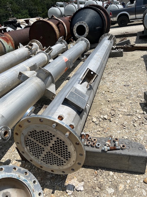 Used 575 sq. ft. vertical exchanger. Mfg. by Louisville Exchanger and Vessel in 2021. 16" diameter x 16'0" F/F. Shell, tubes and heads all 304 stainless steel. 75FV psi @ 250 deg. F. shell. 75FV psi @ 360 deg. F. tubes. (184) 3/4" O.D. x .049".