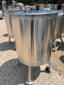 Used 125 gallon Sanitary stainless steel mix tank. Mfg. by Ross. Model MIXTANK. 2'8" diameter x 3'0" length. Atmospheric. Vertical Tri clamp connections. Flat removable top and dished bottom. On (4) legs mounted on casters.