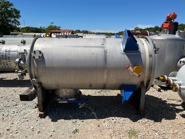 Unused 750 gallon vertical 316L stainless steel tank with external coils on the bottom cone. 4'0" diameter x 8'0" T/T. Mfg. by Equipromex (Mexico) in 2022. Citric acid dosing tank. On leg supports. Flat top and cone bottom. Agitator: Mfg. by Chemineer, 1 hp, 1160 rpm input, 230/460 volts.