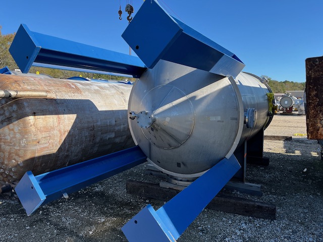 Unused 3200 gallon vertical 316 stainless steel tank with 316LSS internal coil. 6'3" diameter x 13'1" T/T. Acid detergent tank. Mfg. by Equipromex (Mexico) in 2022. On leg supports. Flat top and Cone bottom.