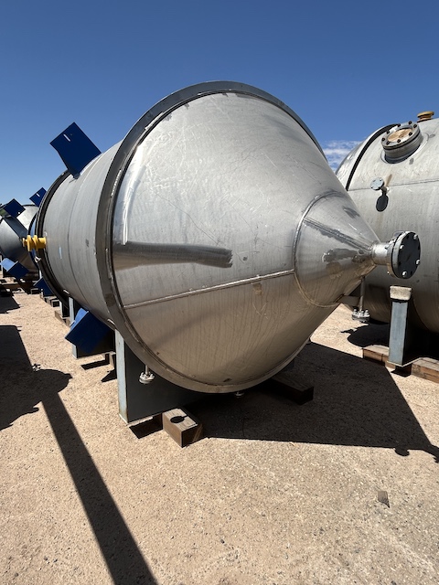Unused 2800 gallon vertical 304 stainless steel tank with 304 stainless steel steam coil. Filter elements cleaning tank. Mfg. by Equipromex (Mexico) in 2022. 7'1" diameter x 8'2" T/T. Flat top and cone bottom. On lug supports.