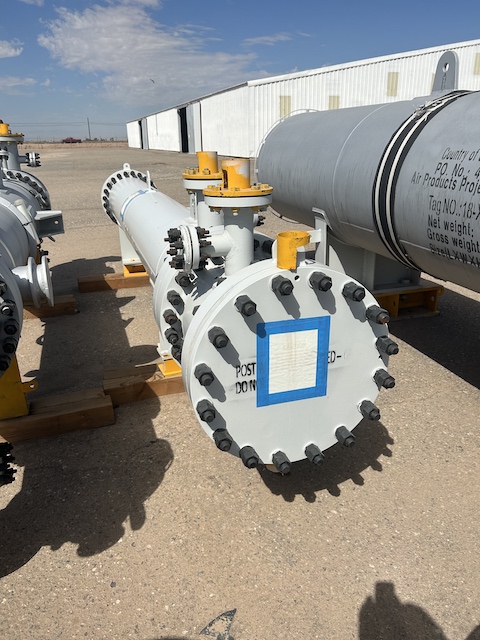 Unused 767 sq. ft. heat exchanger. Mfg. by Wuxi chemical Equipment in 2023. 1.928 Design duty (MMBTU/Hr). Shell Design Rating: 150/FV psig @ 300/300 deg. F. Tube Design Rating: 120 psig @ 150 deg. F. Shell mawp 557/FV psig @ 300 deg. F. Tube mawp 147 psig @ 150 deg. F. 21.125" X 162". Inlet Cooler. Under Nitrogen Purged.