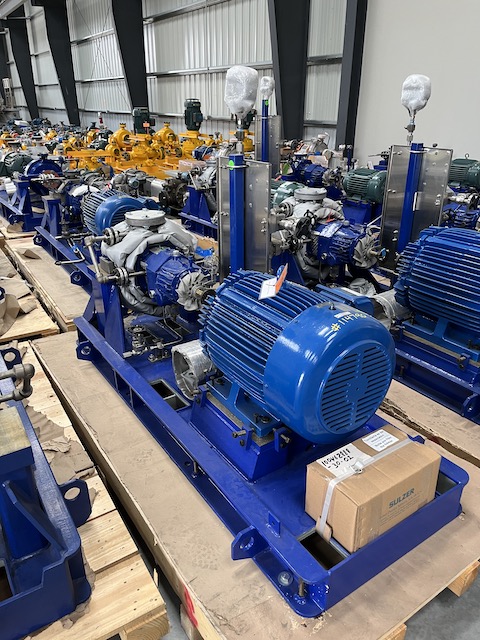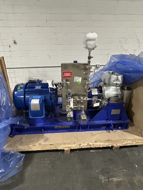Unused Centrifugal Pump. Feed Transfer Pump. Mfg. by Sulzer. Size 3x4x9-1. 660 gpm @ 265' head. 574 psi @ 250 deg. F. Casing 316SS. Impeller 316SS. API Class A-8. With 75 hp motor.