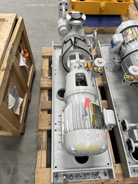 Unused Jacketed Magnetic Driven Single stage Centrifugal Pump. Jet Stripper Vapor KO Drum Pump. Pump case has a steam jacket. Mfg. by Roth. Size 2x1.5. 10 gpm @ 337.4 head. 458 psi @ 565 deg. F. Casing 316 SS. Impeller 316 SS. With 5 hp motor.