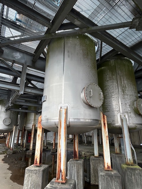 Unused 2169 gallons Vertical 304 Stainless Steel Vessel. Manufactured by Crown Iron Works in 2007. Dished Heads, Leg Supports, Rated ATM @ 300ºF. 14'5" Overall Length, 20" Side Manway.