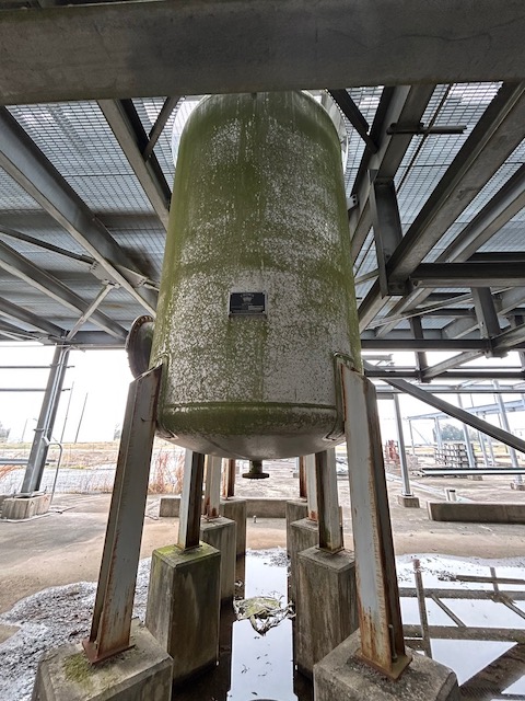 Unused 2169 gallons Vertical 304 Stainless Steel Vessel. Manufactured by Crown Iron Works in 2007. Dished Heads, Leg Supports, Rated ATM @ 300ºF, 14'5" Overall Length, Side Manway.