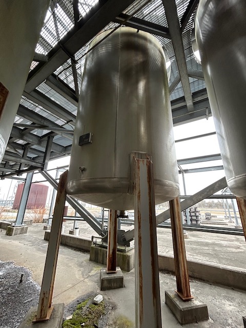 Unused Stainless Steel Vertical 1100 gallon Vessel. Mfg. by (Pagent Equipment) Crown Iron Works. 5' diameter x 8' Length. Dished Heads. On Leg Supports.