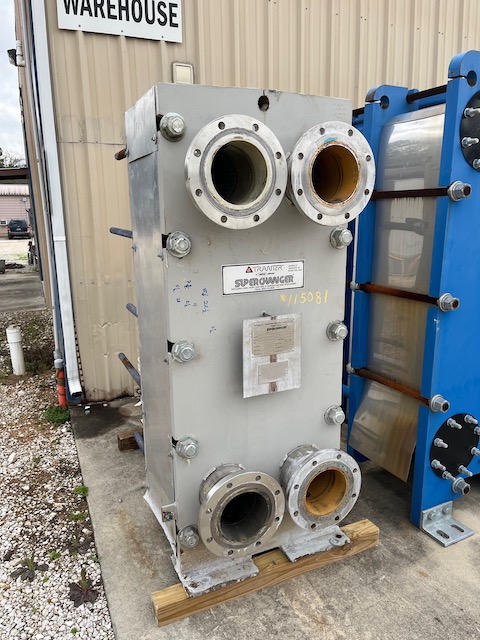Used 634 sq. ft. Vertical Plate Exchanger. Mfg. by Tanter Superchanger in 2005. Model #UXP-060-M-6-UP-106, Carbon Steel Frame, 150 psi @ 350 deg. F. (106) 316 Stainless Steel Plates, 150 psi @ 350 deg. F. Previous Service: RX2208 & RX2209.
