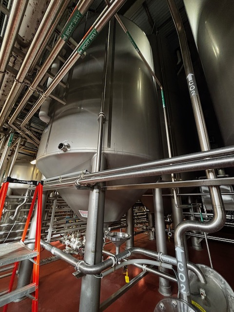 Used 8300 gallon, Model "F" Cone Bottom, 304 Stainless Steel Tank, Dimple Jacketed, cone bottom. Manufactured by Mueller. Model F. Internal 14.9 PSI @ 100 F. Cooling Jacket 100 PSI @ 100 F. 143"T/T x 117"ID. 267" OAH. Dome top. 16" Bottom cone manway with 3" CBO. (4) Leg mounted. Weight 8680 lbs. Built 2010. Previous use: 200 BBL brewery fermentation vessel.