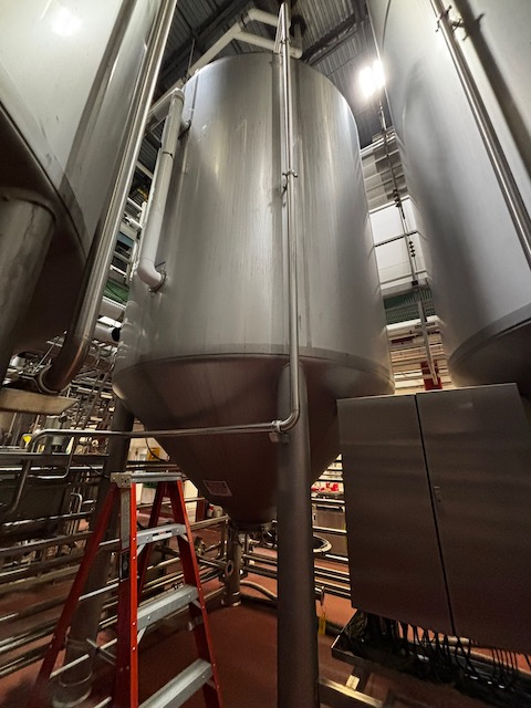 Used 8,300 gallon 304 Stainless Steel tank, dimple jacketed, cone bottom. Manufactured by Mueller. Model F. Internal 15 PSI @ 100 F. Cooling Jacket 100 PSI @ 100 F. Dome top. 265"OAH x 117"ID. (4) Leg mounted. 8680 lbs weight. Built 1995. Previous use: 250 BBL Brewery Brite Beer Tank.