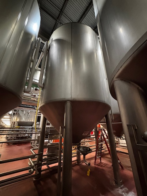 Used 8,300 gallon 304 Stainless Steel tank, dimple jacketed, cone bottom. Manufactured by Mueller. Model F. Internal 15 PSI @ 100 F. Cooling Jacket 100 PSI @ 100 F. Dome top. Previous use: 250 BBL Brewery Brite Beer Tank.