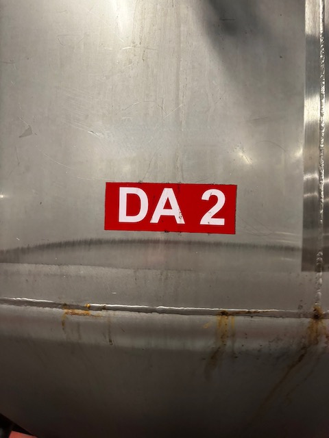 Used 1000 gallon Stainless Steel Dimple Jacketed tank. Built By Mueller. Dome Top, cone bottom. (4) leg mounted. Past use DA2 tank.