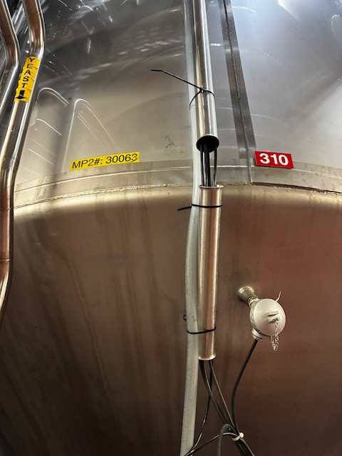 Used 8300 gallon 304 Stainless Steel tank, dimple jacketed, cone bottom. Manufactured by Mueller. Model F. Internal 14.9 PSI @ 100 F. Cooling Jacket 100 PSI @ 100 F. 143"T/T x 117"ID. 267" OAH. Dome top. 16" Bottom cone manway with 3" CBO. (4) Leg mounted. Built 2010. 200 BBL brewery fermentation vessel.