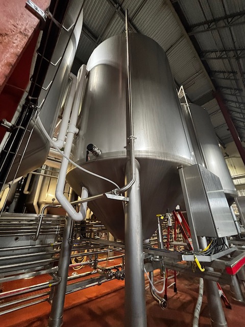 Used 8300 gallon 304 Stainless Steel tank, dimple jacketed, cone bottom. Manufactured by Mueller. Model F. Internal 14.9 PSI @ 100 F. Cooling Jacket 100 PSI @ 100 F. 143"T/T x 117"ID. 267" OAH. Dome top. 16" Bottom cone manway with 3" CBO. (4) Leg mounted. Built 2010. 200 BBL brewery fermentation vessel.