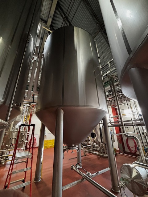 Used 8300 gallon 304 Stainless Steel tank, dimple jacketed, cone bottom. Manufactured by Mueller. Model F. Internal 14.9 PSI @ 100 F. Cooling Jacket 100 PSI @ 100 F. 143"T/T x 117"ID. 267" OAH. Dome top. 16" Bottom cone manway with 3" CBO. (4) Leg mounted. Built 2010. 200 BBL brewery fermentation vessel.