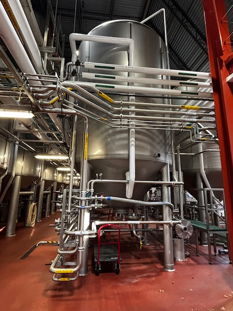 Used 8300 gallon 304 Stainless Steel tank, dimple jacketed, cone bottom. Manufactured by Mueller. Model F. Internal 14.9 PSI @ 100 F. Cooling Jacket 100 PSI @ 100 F. 143"T/T x 117"ID. 267" OAH. Dome top. 16" Bottom cone manway with 3" CBO. (4) Leg mounted. Built 2010. 200 BBL brewery fermentation vessel.