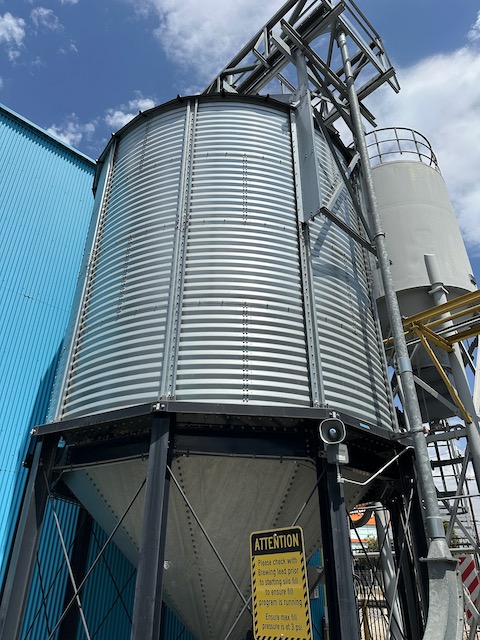 Used rivoted carbon steel vertical grain silo. Atmospheric. Dished top head and cone bottom. Leg supports
