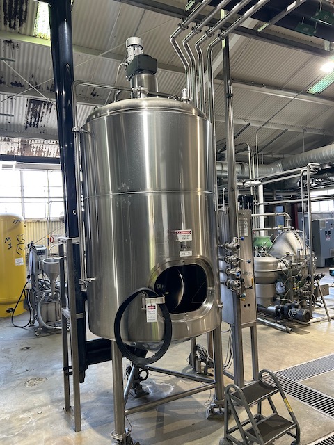Used 600 gallon 304 Stainless Steel jacketed mix tank. Manufactured by JVNW. Agitated Yeast Brink. Dimple Jacket Design Pressure 115 PSIG @ 200°F. (3) Leg mounted. 2 HP motor with two tier agitator. 16" x 22" side manway. Overall dimensions: W-4'10" x L- 4'7" x H- 13' w/ agitator. Built 2014. Dished top head & conical bottom head. Previously used in brewery.