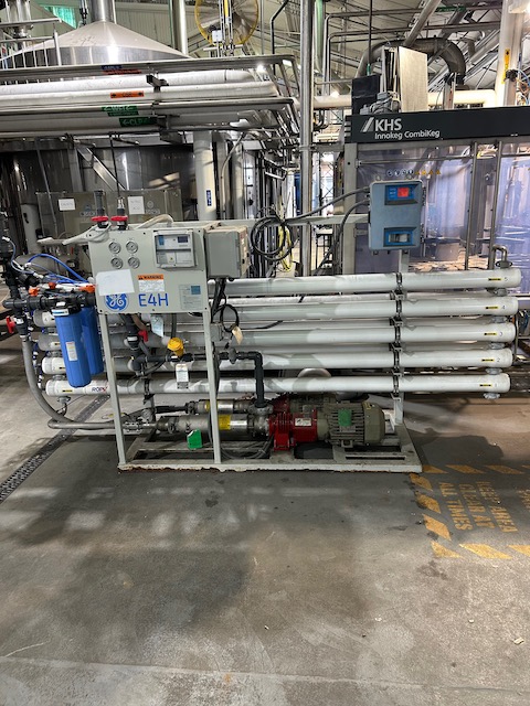 Used 30 GPM RO system. Manufactured by GE. Model #RO,E4H-43K-DLX,460,6,LE. 60 psi max inlet pressure. 30 GPM @ 77°F permeate rate. Includes TONKAFLO SS5508D RO pump and TONKAFLO SS5503G CIP pump.